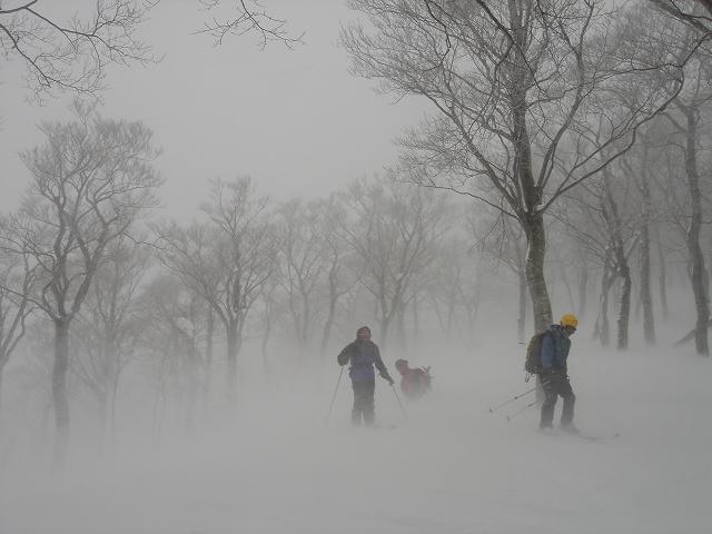 で、視界も悪くピークも拝まぬまま敗退…。そういえばこんな不安定な積雪を